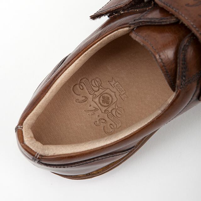 アッパー素材には上質なキップレザーを仕様し、革本来の自然な風合を残しながら、アンティークに仕上げている。